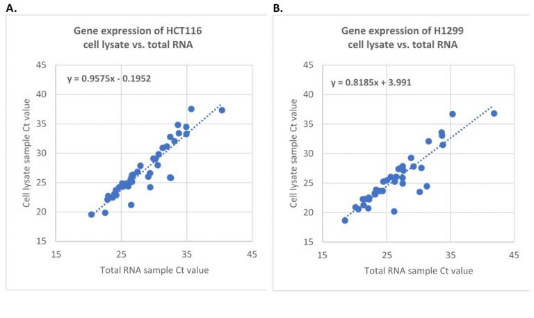 图二:使用常规RNA提取法及CytoCt?裂解法分别处理相同数量的细胞,通过One-Step RT-qPCR检测基因表达情况。每个反应的细胞量约为1500个。A. 检测HCT116细胞中的42个基因。B. 检测H1299细胞中的37个基因。