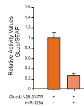 已知LIN28基因是miR-125a的靶标。HEK 293细胞转染Lin28 miRNA靶标序列表达克?。ㄗ螅┗蛘吖沧緈iR-125a前体miRNA表达克隆(右)。转染24小时后检测GLuc 和内参SEAP活性。仅转染Lin28 miRNA靶标序列表达克隆的细胞中Gluc和SEAP活性之比定为1(左),以此确定共转样本中的比值。如图所示,miR-125a抑制了GLuc-LIN28-3′-UTR克隆中Gluc 70%以上的活性。